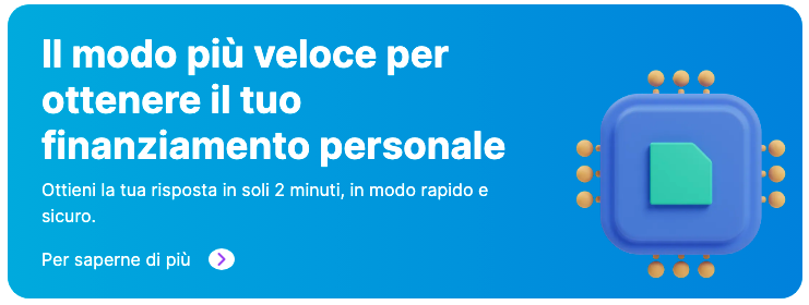 Il modo più veloce per ottenere un finanziamento personale. Riceverai la risposta in 2 minuti in modo rapido e sicuro.